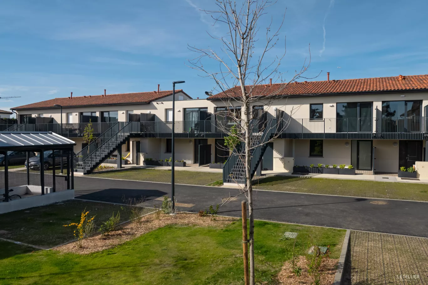 Ariana est un projet de 24 logements en trois corps de bâtiments en R+1, à l’échelle du quartier et déclinant différents types d’habitat : Deux bâtiment proposent des logements intermédiaires qui ont l’avantage d’être directement accessibles par l’extérieur. Ils jouissent aussi tous d’au moins un espace privatif aérien, terrasse ou balcon, ainsi que des jardins en supplément pour les logements en RDC. Les pièces de vies sont traversantes et donnent directement sur ces espaces. Un travail soigné a été apporté aux éléments de serrurerie très présents en façade, ainsi qu’au volume des escaliers, dessinés comme des éléments légers malgré leur matérialité. Le troisième bâtiment est composé de 4 maisons mitoyennes en duplex avec un jardin à l’opposé de la zone partagée et de stationnement. Elles ont visuellement une identité propre, marquée volumétriquement par une toiture tuiles à double pente et une façade rythmée. L’ensemble construit s’articule autour d’espaces verts partagés intégrant des place de stationnement paysagées et qui permettent une respiration dans la continuité des constructions environnantes. Les jardin privatifs ont été travaillés dans la même dynamiques : les séparatifs ont été voulus les plus légers possibles et supportant des haies vives vouée à les faire disparaitre dans la végétation.