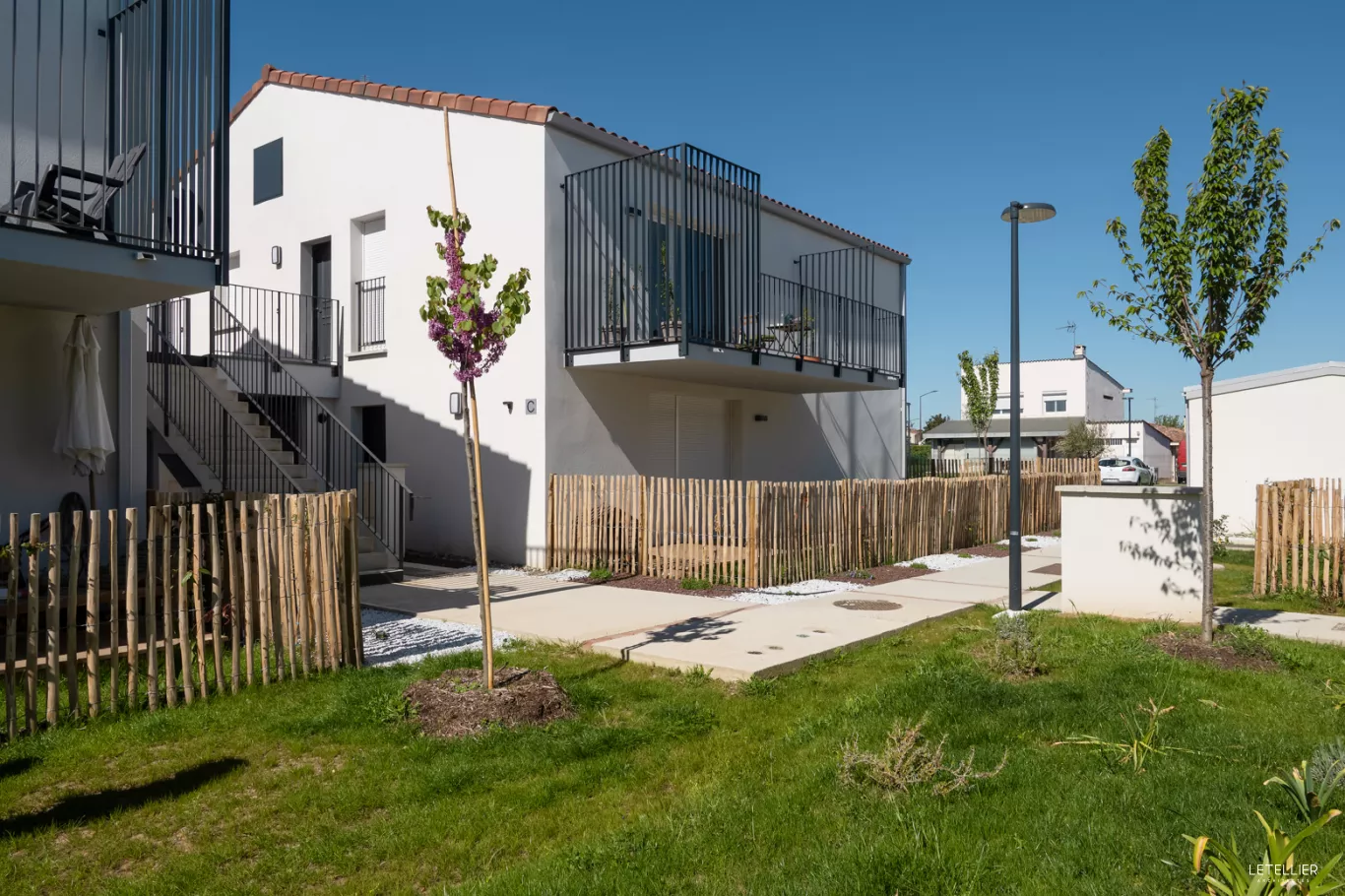 Intégrés au cœur du quartier résidentiel de Saint-Simon, ces logements conservent l’échelle de grandes maisons individuelles, tout en développant des modes d’habitats intermédiaires et mitoyens. Dans un parc composé de jardins privés et d’espaces partagés, on retrouve 4 « maisons » séparées en appartements, desservies par des coursives extérieures. En RDC, les espaces verts sont fondus les uns dans les autres grâce aux clôtures à ganivelles de faible hauteur, vouées à disparaître dans la végétation. Le projet est attentif à préserver la végétation historique de cet ancien jardin privé et au milieu de tout cela serpentent les chemins piétonniers desservant les logements. Aux étages, des éléments en serrurerie sont travaillés pour préserver l’intimité des espaces extérieurs privés, sans les cloisonner et en privilégiant les perspectives sans vis-à-vis.