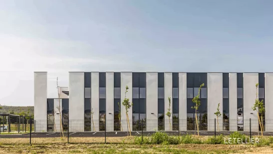 L’architecture donne la part belle au bardage métallique laqué tramé de légères ondes arrondies et régulières ainsi qu’aux généreuses ouvertures baignant de lumière le bâtiment.