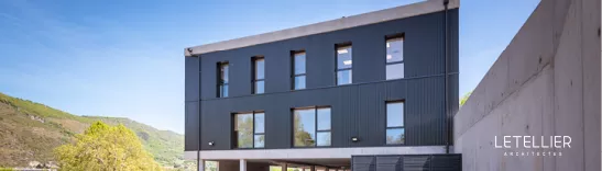 Construction d’une agence Pôle Emploi de 960m² SP, sur un terrain à flanc de colline. La simplicité de la forme rectangulaire du bâtiment permet de limiter l’impact sur la parcelle. Les façades contemporaines sont composées de béton brut et d’un bardage en acier ondulé de teinte gris foncé rythmés par de grandes baies vitrées.