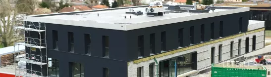 Le bâtiment de 1700 m² est constitué de deux niveaux et offrira en grande partie des bureaux ainsi que l’aménagement d’un parking partiellement enterré sur pilotis.