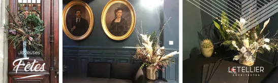 Une ambiance appréciée de tous, clients et collaborateurs sont enchantés par les guirlandes végétales, couronne d’entrée et bouquets aux touches dorées tous réalisés avec soin par l’Atelier Poppy Figue.