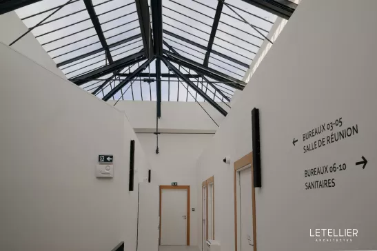 La réorganisation des espaces et des circulations a été conçue pour simplifier les parcours et améliorer l’expérience des usagers. La verrière centrale, élément phare du projet, capte la lumière naturelle et baigne les espaces d’une clarté douce et homogène. Les choix esthétiques et fonctionnels reflètent une volonté de sobriété et d’élégance avec le choix de teintes neutres de blanc, gris pastel et bois clair.