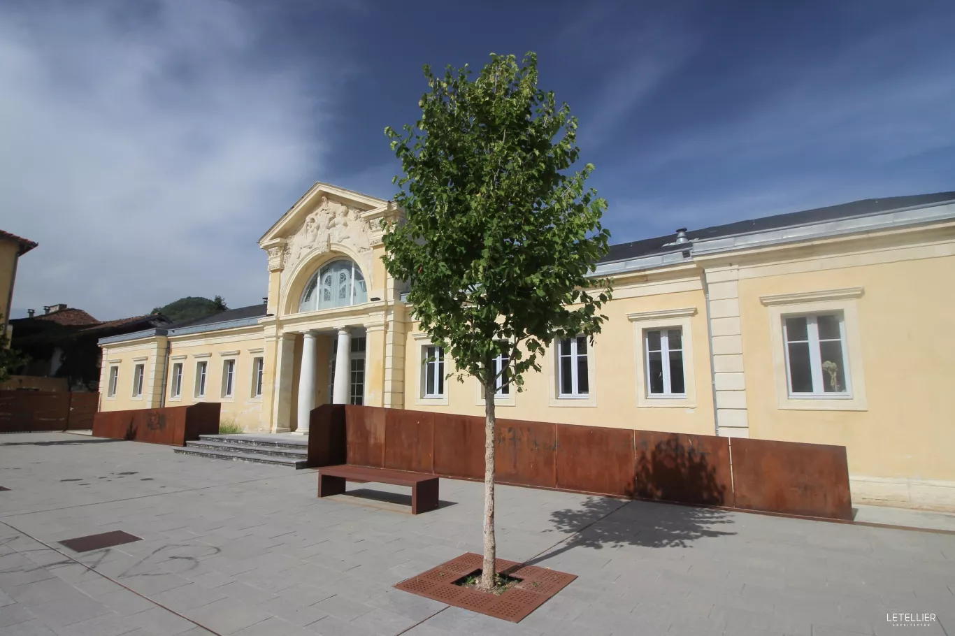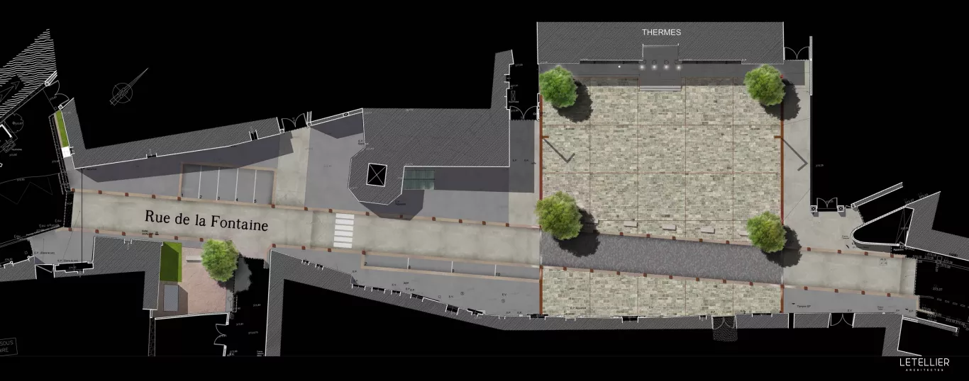 La mairie d’Encausse les Thermes souhaitait revoir l'aménagement de son coeur de village afin de permettre une circulation fluide entre piéton et véhicules. Afin de fusionner ces deux usages sur l'espace de la place des Thermes, une plateforme surélevée a été réalisée permettant d'aménager une voie automobile distincte. La réhabilitation de la place en elle-même devait conserver la capacité à servir à des usages divers (place de village et marché notamment). Les matériaux utilisés sont d'origine locale, comme la pierre de Saint-Gaudens, pour rendre hommage à l'authenticité de la région.