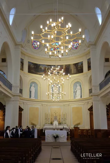 La restauration, pensée en deux étapes, a permis de rendre à ce lieu toute sa richesse architecturale et son rôle central. À l’intérieur, l’approche s’est concentrée sur la révélation et la restitution des décors historiques. Sous les couches de peintures successives, les analyses ont permis de redécouvrir une polychromie originale en camaïeu gris-vert rehaussée de dorures. Les plafonds et sols, autrefois marqués par l’usure, ont été restaurés pour retrouver leur éclat d’origine, et les tribunes ont été renforcées pour retrouver leur usage en toute sécurité. Un soin particulier a également été apporté à la préservation du mobilier liturgique, notamment l’orgue classé Monument Historique.