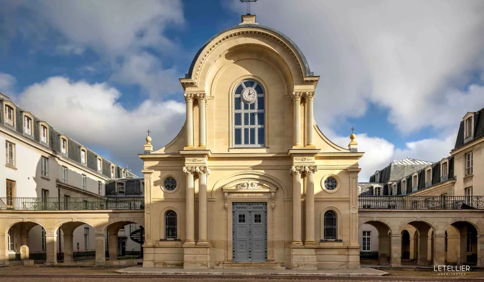 La Grande Chapelle, au cœur de la Maison d’Éducation des Loges à Saint-Germain-en-Laye, témoigne de plusieurs siècles d’histoire et d’usage. Construite entre 1857 et 1859 par l’architecte Amédée-Alphonse Lejeune, cette chapelle néoclassique, autrefois rattachée à un couvent des Augustins, a accompagné la transformation du site en maison d’éducation pour orphelines en 1811, sous l’impulsion de Napoléon Ier. Avec son vaisseau central, ses tribunes et ses façades en pierre de taille, elle occupe une place centrale dans la composition architecturale de l’établissement.