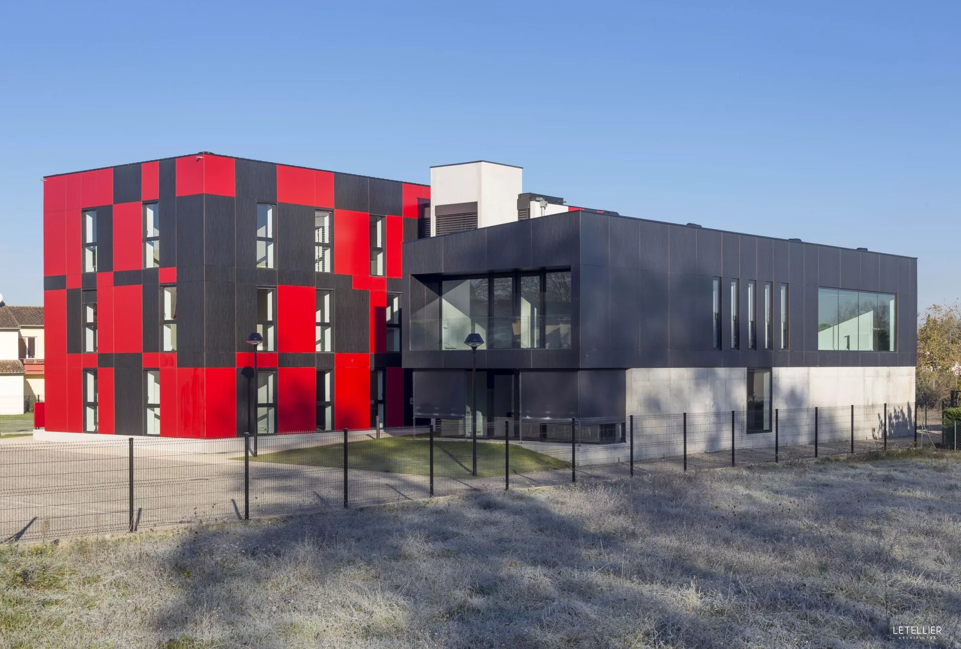 Ce bâtiment est composé de deux volumes reliés par une passerelle vitrée dotée d'un ascenseur. C’est dans cet espace interstitiel, que se situe l’entrée du projet. L’aménagement se veut compact mais structuré, avec un axe transversal fort entre les deux voies publiques, renforcé par la présence de cette faille vitrée entre les deux corps de bâtiment.