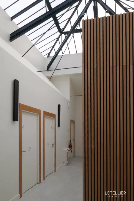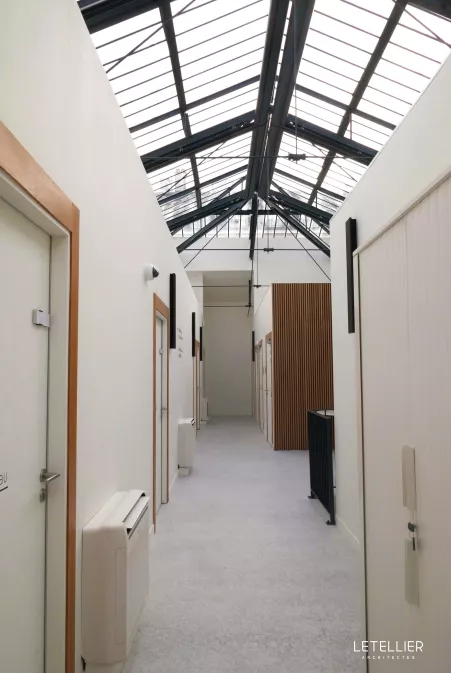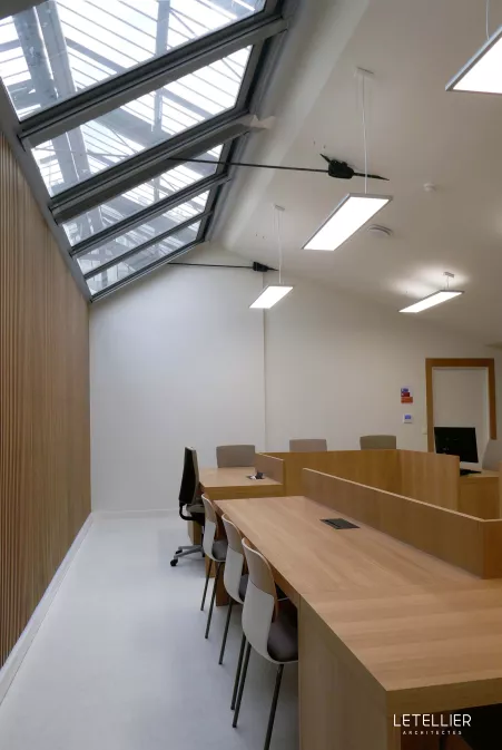 La réorganisation des espaces et des circulations a été conçue pour simplifier les parcours et améliorer l’expérience des usagers. Les flux entre le public et les professionnels sont clairement séparés grâce à des entrées distinctes et des cheminements évidents. La verrière centrale, élément phare du projet, capte la lumière naturelle et baigne les espaces d’une clarté douce et homogène.