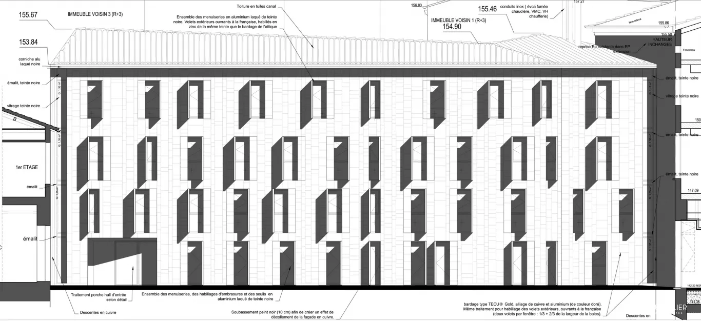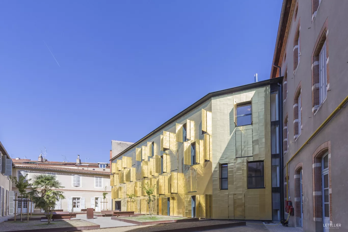 Dans le cœur historique de Toulouse, à proximité immédiate de la place du Capitole, l’ancien Collège de Foix est un immeuble à la fois inscrit à l’inventaire supplémentaire des monuments historiques et dont le donjon de 1457 est classé monument historique. Géré par les Sœurs de la Congrégation Notre-Dame de la Compassion, il accueille plusieurs entités dont une résidence étudiante et un EHPAD – le projet d’ajout d’un EHPAA se trouve donc dans la continuité de la destination du lieu. Cette extension en R+3 venant "fermer" une cour, l’agence LETELLIER Architectes a saisi l’opportunité pour la traiter en seconde cour d’honneur, créant un parallèle au cloître contigu. Dans la lignée du respect de l’architecture classique préexistante, une réflexion importante a été menée avec l’Architecte des Bâtiments de France afin de proposer un langage architectural à la fois moderne et cohérent avec le bâti ancien. L’idée de départ était de créer une façade rappelant la surface de l’eau, avec ses reflets, ses mouvements et sa douceur, métaphore d’une vie paisible, au calme. Les quatre niveaux sont ainsi revêtus de feuilles de cuivre à emboîtement de couleur dorée, et percés d’ouvertures aléatoires. Le bâtiment est traité comme un véritable objet architectural, qui marque une nouvelle étape dans la continuité de l’évolution urbaine. Le cuivre, un choix de matériau cohérent dans lieu historique par son caractère traditionnel, joue ici le rôle d’un épiderme. Il offre des effets de lumière spectaculaires, d’une grande finesse et élégance, créant une sorte de miroir qui se dématérialise pour donner la part belle aux bâtiments d’origine. La sobriété du traitement du parements, des menuiseries et des volets a été réfléchie dans le but d’accentuer cet effet. Le nouveau bâtiment, avec son volume et ses matériaux nobles, s’intègre parfaitement dans son environnement proche et contribue à embellir un espace urbain qui était jusqu’alors "inachevé".