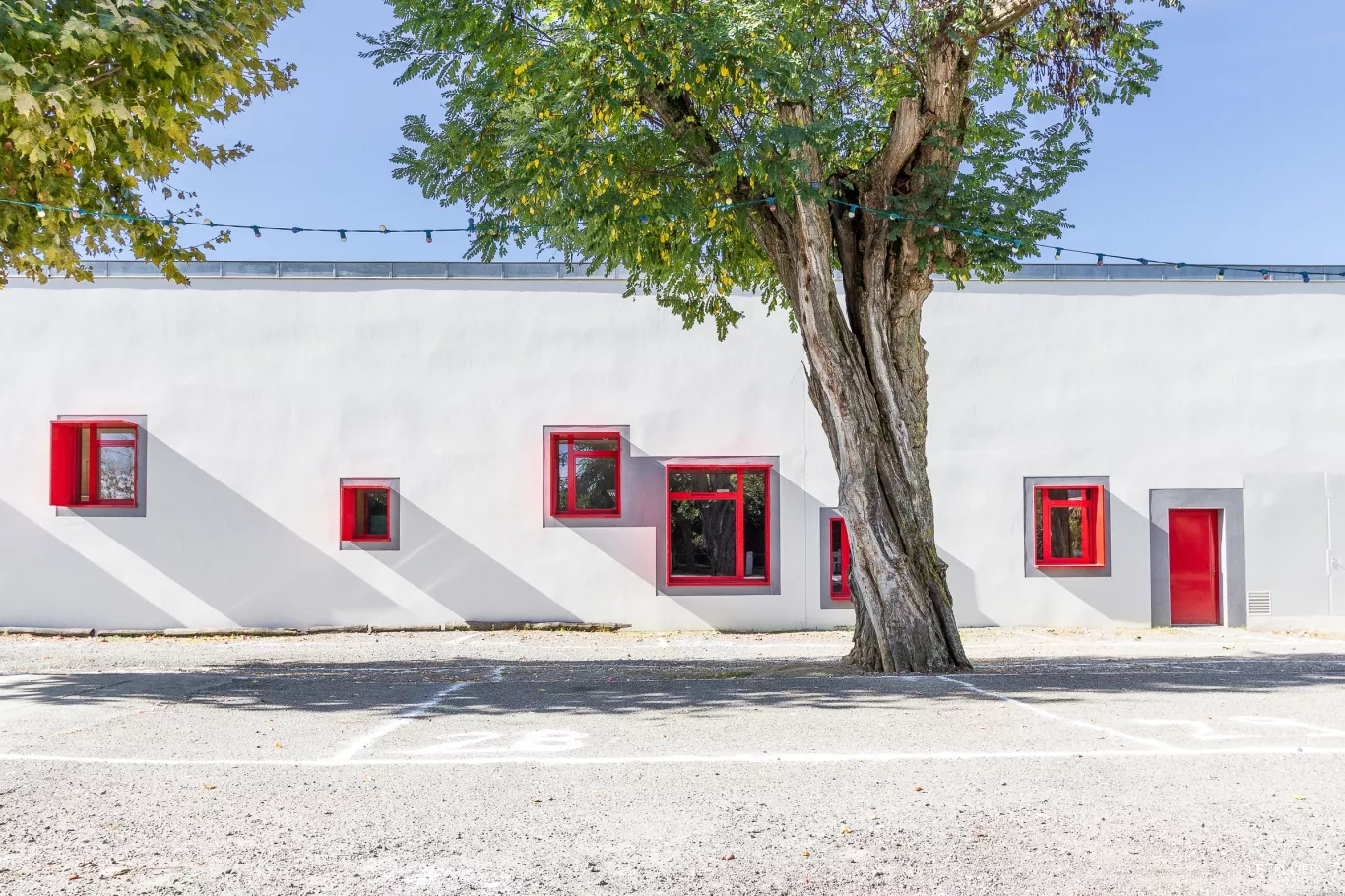 Travaillées de manière contemporaine et d'inspiration ludique, les façades comportent des ouvertures de dimensions variables, créant ainsi un rythme aléatoire. La gestion du soleil a été particulièrement étudiée dans la conception des façades, notamment par l'intégration de casquettes métalliques autour des ouvertures et la mise en place de grands stores en toiles ou à lames orientables. Ces ensembles colorés accentuent l'aspect dynamique et espiègle du bâtiment.