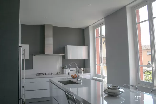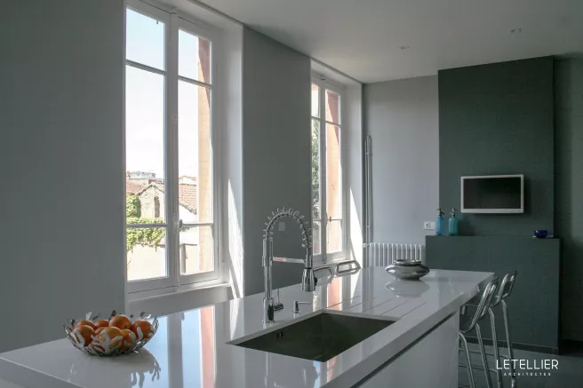 La rénovation de cet hôtel particulier a permis la redistribution des espaces en créant une zone de bureaux au rez-de-chaussée et R+1, un T2 au R+1, ainsi q'un appartement en duplex au R+2 et R+3, anciens combles. L'aménagement intérieur a été conçu de manière à redimensionner et redistribuer les pièces suivant les besoins des propriétaires et apporter de la lumière notamment avec la création de lucarne. Le design et les choix intérieurs ont été particulièrement soignés dans un esprit de modernité.