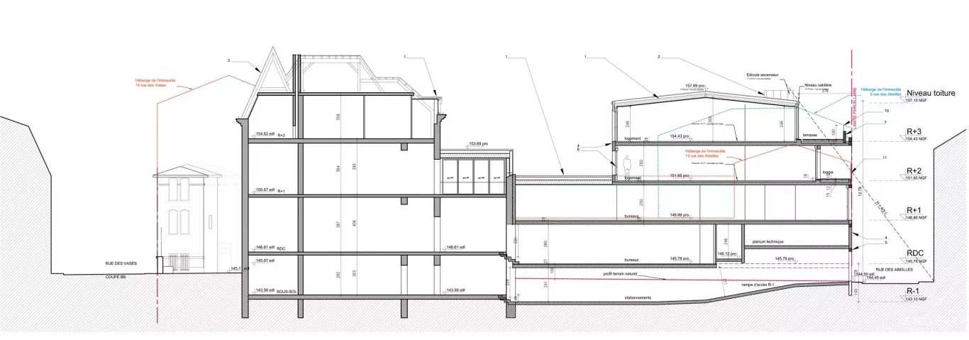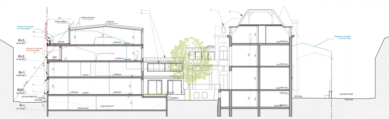 Le projet est né de la volonté d'intégrer le partimoine existant à l'opération neuve constituée de 7 logements et d'une surface de bureaux . Le projet propose donc la rénovation de la partie existante et l'ajout d'une partie neuve en arrière de la parcelle, dans la même logique que les bâtiments avoisinants. A l'instar de sa composition volumétrique, le programme traite l'ensemble du projet comme un tout cohérent. Au centre de la parcelle, un espace végétalisé permet de conserver un cœur calme.