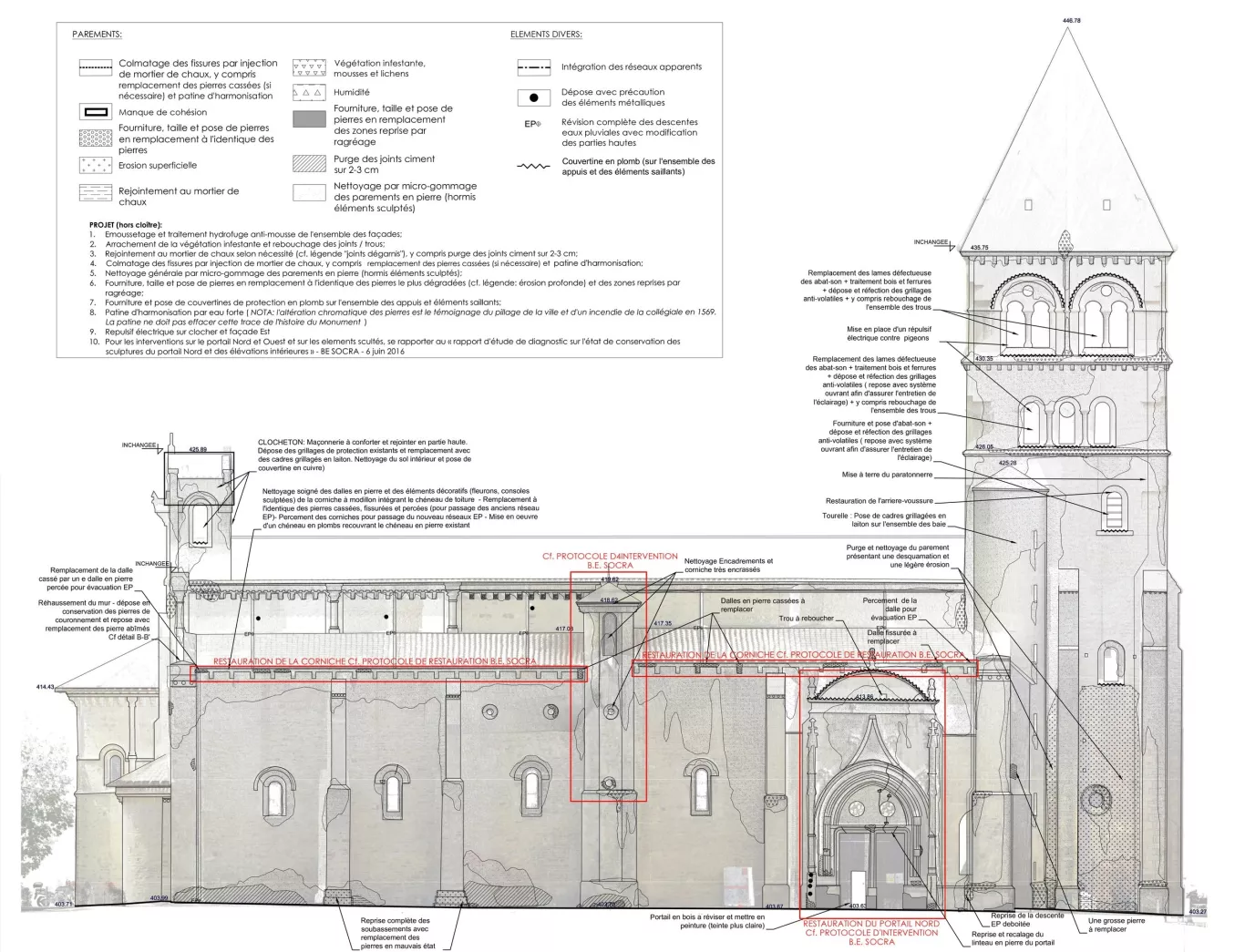 Les zones d'intervention des travaux se concentrent sur l'ensemble des façades de la collégiale y compris le clocher et les toitures.