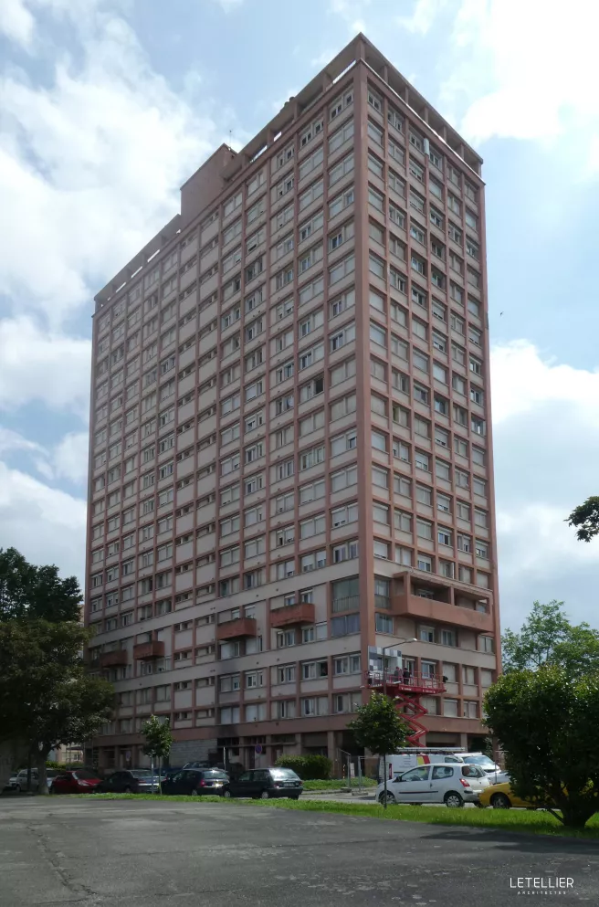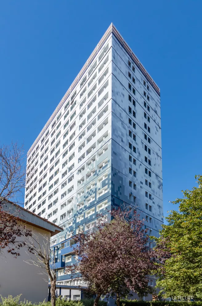 Tour de logement sociaux réalisée en 1968, la tour des Mazades totalise 19 étages de logements sociaux. Le projet consiste en la restauration thermique de l'édifice et la mise en conformité des communs et du toit terrasse. Pour habiller la tour, une multitude de lames métalliques colorées viennent créer un dégradé qui joue avec la lumière du site et la couleur du ciel. La tour des Mazades, élancée, offre un nouveau visage pour un quartier apaisé, des logements confortable et économe au coeur d'un parc urbain paysager.