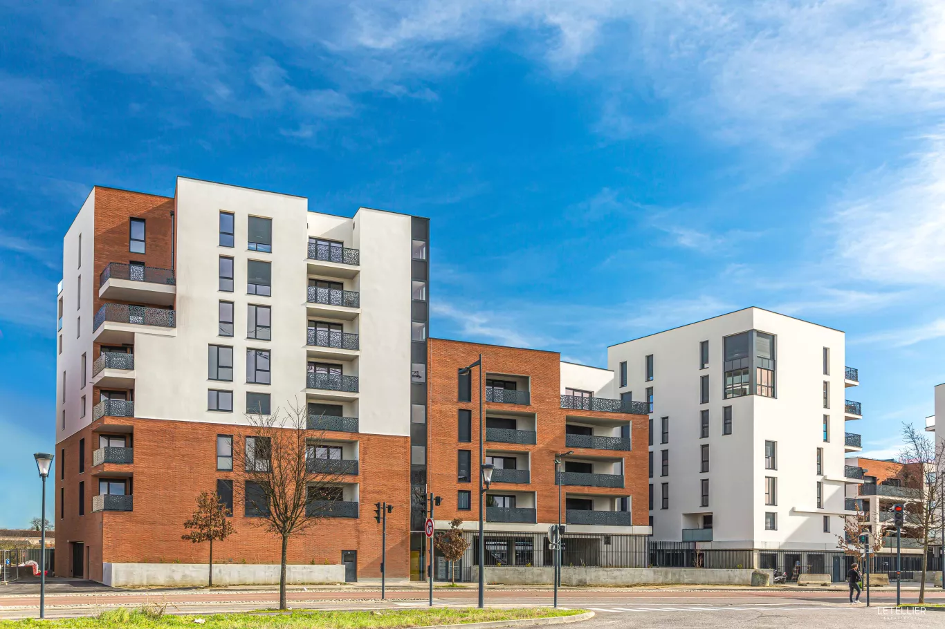 De par sa temporalité et sa position au sein du futur faubourg Malepère, ce projet est emblématique. Il a fait l’objet d’un travail collectif réunissant aménageurs, urbanistes, architectes, services de la ville. Les 6 bâtiments de notre intervention présentent des façades résolument contemporaines et sont implantés en faveur d’espaces urbains à vivre. Forts d’une lecture harmonieuse de par leur architecture, les bâtiments s’ouvrent sur un cœur d’ilot entièrement paysagé et habité par de nombreux usages : boulodrome, terrasses collectives… Un socle en lames métalliques gris offre une transparence sur les RDC, consacrés aux stationnements. Chaque entrée est mise en valeur par des jardinières végétalisées. Au-dessus, jusqu’à une hauteur de 25m, surplombent des volumes en enduit blanc gratté fin rythmés par un jeu de creux en briques rouge.