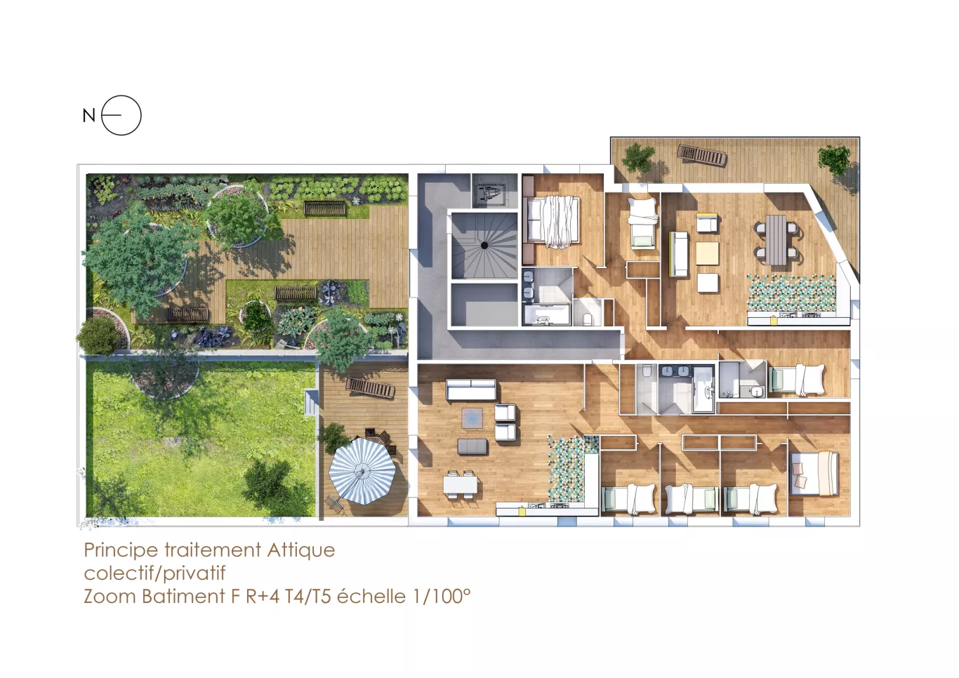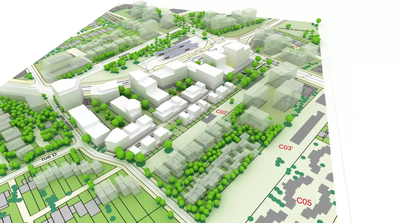 - Traitement des espaces paysagers, création d'une voirie, mobilier urbain, gradins, jeu de découpage de balcons
